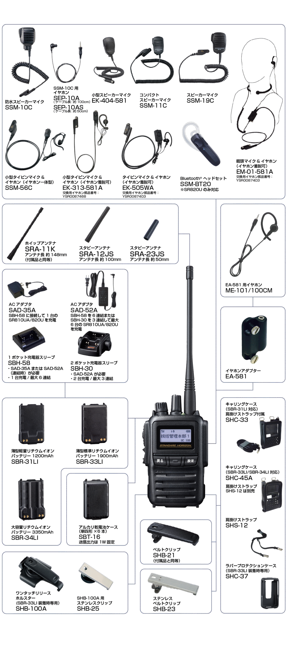 | 重量 | 約237g(SBR-33LI、アンテナ、アクセサリーコネクタ保護カバーを含む) |