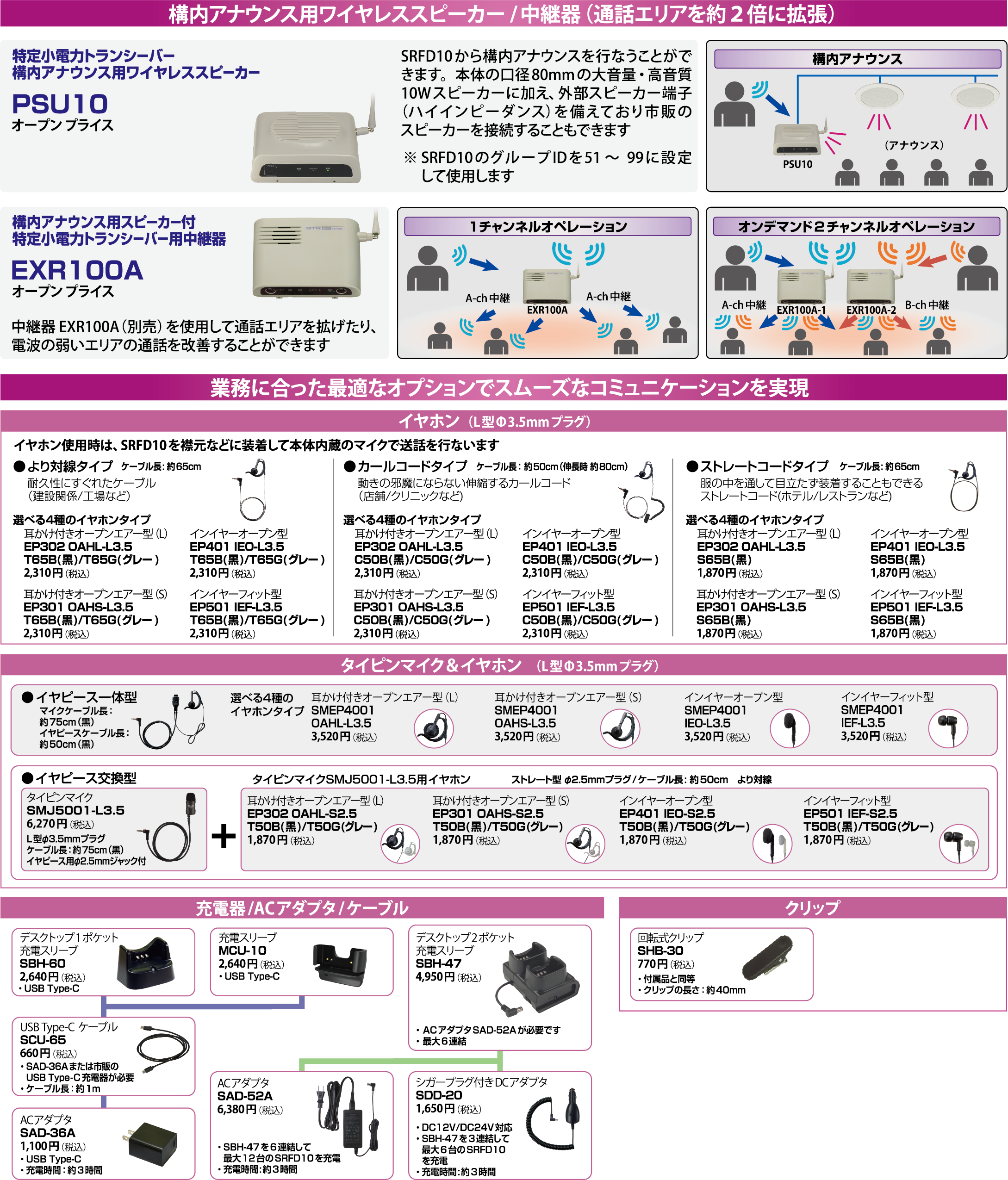 トランシーバー同士の交互通話、中継器 EXR100Aを使用した通話エリアの拡張が可能です。