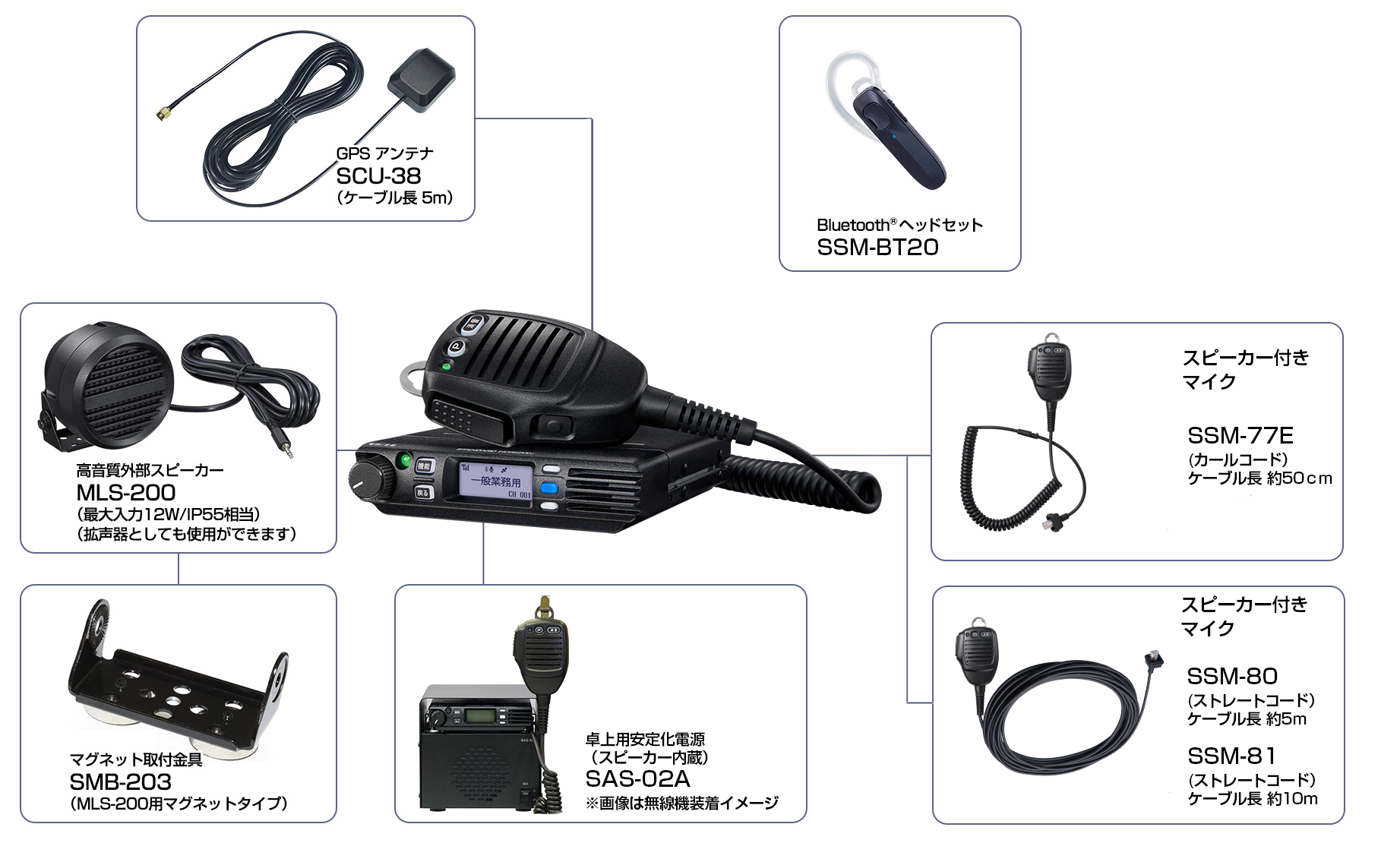 一般業務用4値FSK方式のデジタル通信方式と従来のアナログ通信方式の両方に対応するデュアルモード。設置場所を選ばないコンパクト設計で高い基本性能と耐久性を備えています。プログラムキーを装備し手元で主要操作が可能なスピーカーマイクは優れた操作性を実現します。緊急時のCUE(キュー)機能によるアラーム送信、外部スピーカーを使ったPA(拡声器)機能、ブルートゥースヘッドセットを使用したハンズフリー運用など多彩な機能を搭載し業務連絡を支えます。